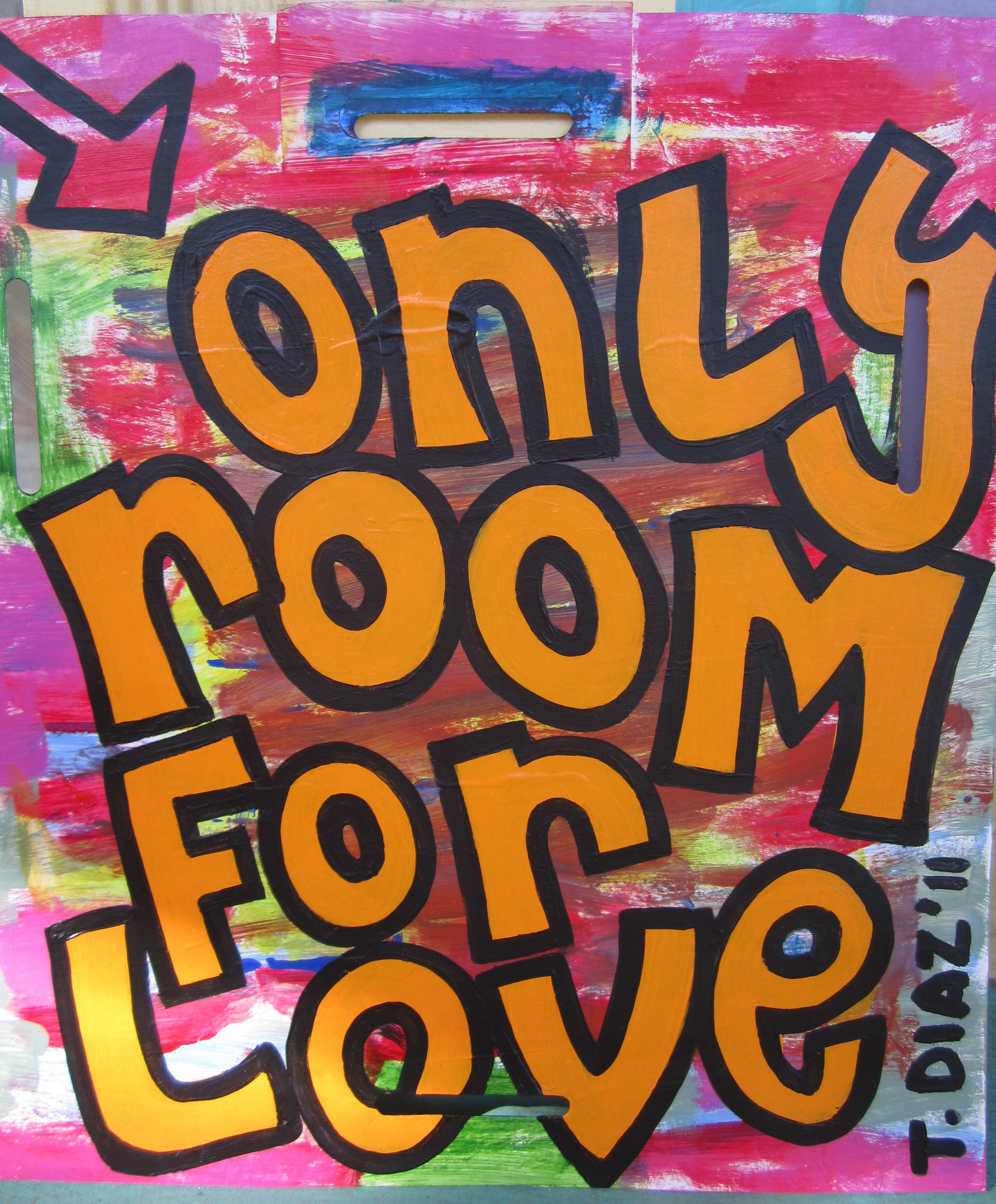 “Only Room For Love” by Tamara Diaz (2011) This is a mixed media piece which is part of the Recycled Art Project, which spans over years. The project entails a collection of packaging from regularly used items which could otherwise be garbage. While working on other pieces, I use the left over paint from my brushes to create the backgrounds of the pieces, with the paint which would otherwise be thrown out. This is an important process on many levels as it allows me to get dirty and it is an experimental process. The last step is to use words to communicate feelings, whether they are about love, passion, wishes or heartbreak.