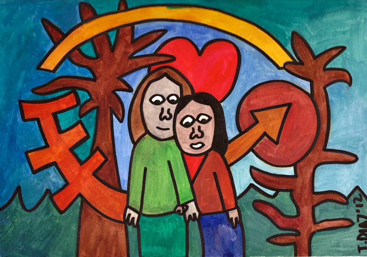 “Tamara and Kim” (2012) This is watercolor piece painted in Cabarete, Republica Dominicana Date: March 31, 2014Author: Tamaradiazart Category: 2012, Watercolor Paintings Post navigation ← Mi Familia (March 2011) This is a drawing of my family done in an art therapy session with a child who was working on their family portrait. In this piece, a few symbols are used; such as my Papi holding his Virgencita (La Caridad Del Cobre) necklace that he lost in Barcelona. Abuela is holding the Cuban flag and I am holding my paint brush. “World on My Shoulders” (2004) Acrylic Paint on Canvas. → Share this: Click to share on X (Opens in new window) X Click to share on Facebook (Opens in new window) Facebook Like Loading... Related