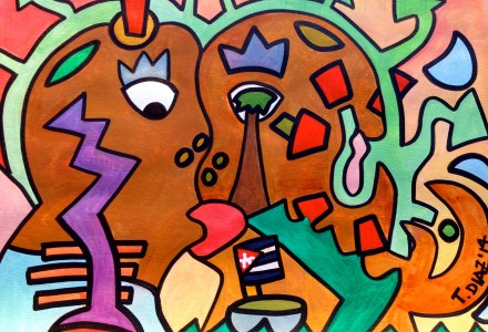 Untitled Watercolor Piece by Tamara Diaz (2014) This piece includes symbolism related to the Balseros who risk their lives to leave Cuba to reach US soil.