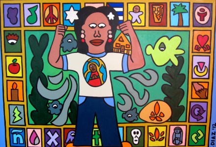 Fuerza (2012) by Tamara Diaz (30×40) Acrylic Paint on Canvas. The design was painted on October 15, 2011 the day of the Occupy Providence Rally and Day #7 of my cleanse. I was feeling strong and empowered. The outline of smaller symbols is indicative of all the exhibits that i was doing at the time, and how much art was involved. On my shirt is the Virgencita who is always with me.