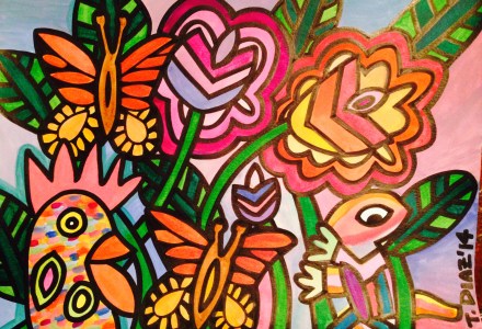 Te Amo (2014) by Tamara Diaz (30×40) Acrylic Paint on Canvas. This is a tragic piece about love, what else? Its a story of a person who loves another so deeply and has not been able to share those words with their lover. The person feels so overcome with grief thinking, “What if i die and I never tell my lover how I feel?” She lays on the floor paralysed and feeling like she will self destruct if she doesn’t confess.