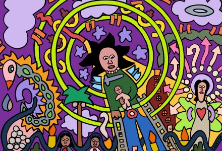 Spirit Communicator (2006) by Tamara Diaz (30×24) This is a story about a device in which the person puts in 10 cents and can take the telephone ears and communicate with their ancestors and loved ones who have passed away.