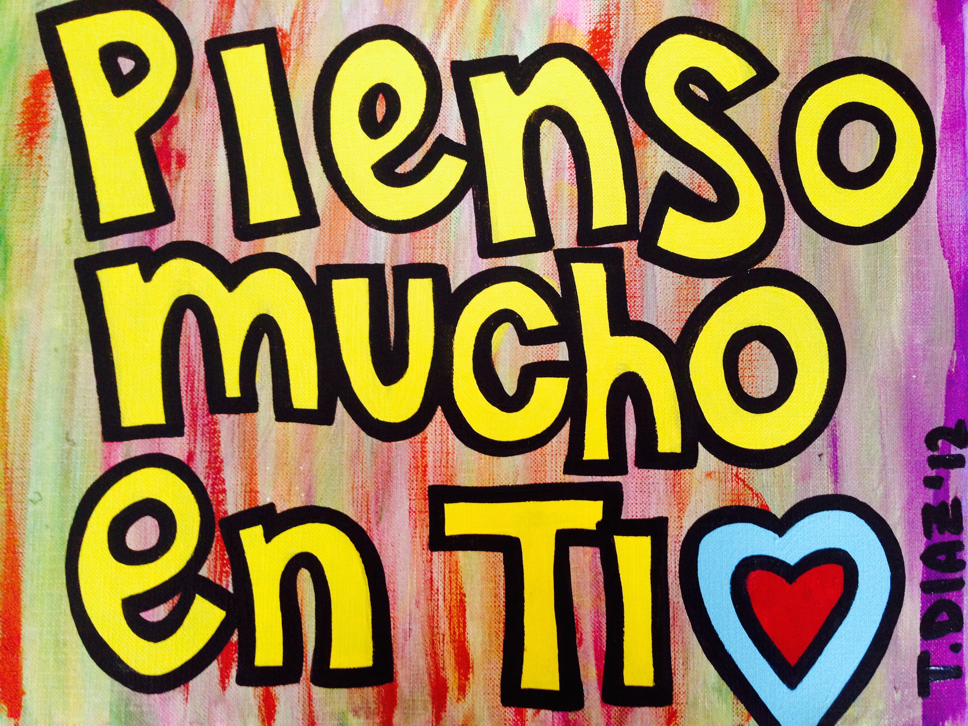Pienso Mucho En Ti (2012) by Tamara Diaz. Acrylic Paint on Canvas. (This is a love dedication!) Date: September 7, 2014Author: Tamaradiazart Category: 2012, Acrylic Paintings, Love Art Post navigation ← Super Power (2012) by Tamara Diaz. Acrylic Paint on Canvas Paper The Reach Out (2012) by Tamara Diaz. Acrylic Paint on Canvas Paper (Love Art!) → Pienso Share this: Click to share on X (Opens in new window) X Click to share on Facebook (Opens in new window) Facebook Like Loading... Related