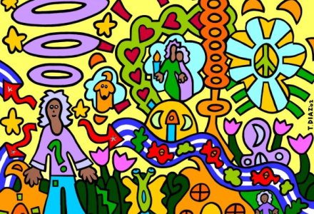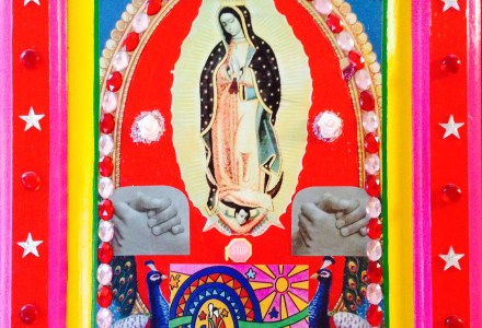 Vaya Con Dios (2002) by Tamara Diaz. This is a mixed media piece which includes Acrylic Paint and collage on a recycled wooden door. The image in the center is of the Virgen Guadalupe, patron saint of Mexico. The image in the bottom center is a smaller version of an original Tamara Diaz piece from1999.